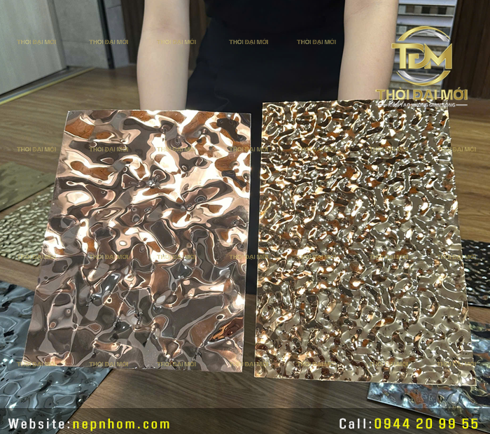 Inox sóng nước hồng gương là loại inox có bề mặt được tạo hình giống như những gợn sóng nước, với màu sắc hồng tím ánh kim sang trọng. Chất liệu này được tạo ra bằng phương pháp dập nổi trên